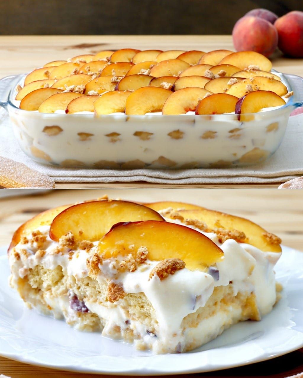 Tiramisù alle pesche: il dessert perfetto per le giornate calde! Si tratta di una variante rinfrescante ed estiva del classico tiramisù che delizierà tutti con il suo sapore e il suo profumo delicati. Il dolce non richiede cottura e, a differenza della versione tradizionale, utilizziamo lo sciroppo di latte al posto del caffè, rendendo il tiramisù sicuro anche per i più piccoli. Copriamo gli strati della torta con un ripieno cremoso di mascarpone con l’aggiunta di pesche fresche e succose e copriamo il tutto con maccheroni tritati: è una vera festa dei sensi!