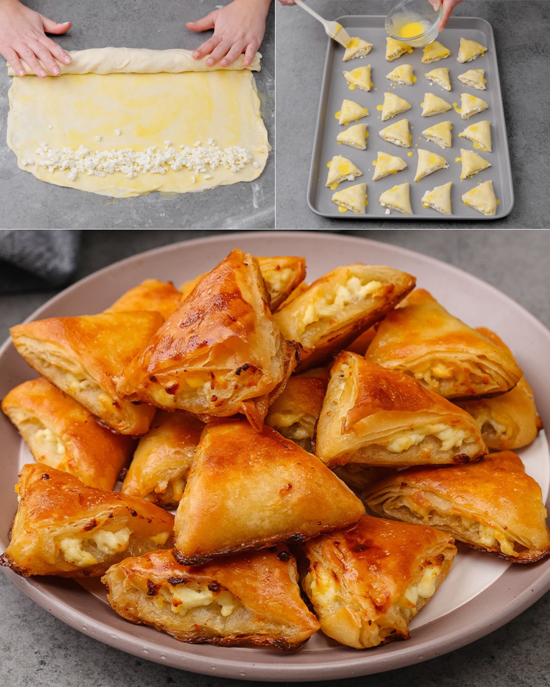 Per portarli in tavola, abbiamo preparato la pasta fillo con farina, acqua e sale, ma puoi comprarla anche già pronta, se vuoi velocizzare al preparazione. La pasta fillo sarà poi divisa in 3 parti, che saranno stese e sovrapposte in strati, spennellati con il burro fuso. Abbiamo poi aggiunto la farcitura a base di ricotta e ricavato i triangolini, che saranno pronti per essere spennellati con l’uovo sbattuto e cotti in forno per circa 20 minuti: otterremmo dei fagottini fragranti fuori e morbidi all’interno, ideali da servire caldi.