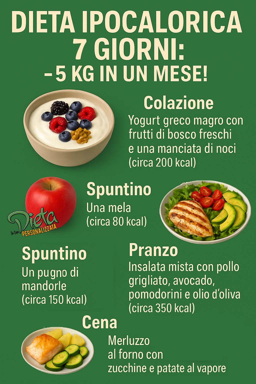 Di seguito trovi un esempio di menù settimanale per una dieta ipocalorica, pensato per aiutarti a mantenere il giusto apporto calorico senza rinunciare a un’alimentazione sana e bilanciata. Ogni giorno è strutturato per garantire un buon apporto di proteine, carboidrati e grassi sani, essenziali per il benessere generale.