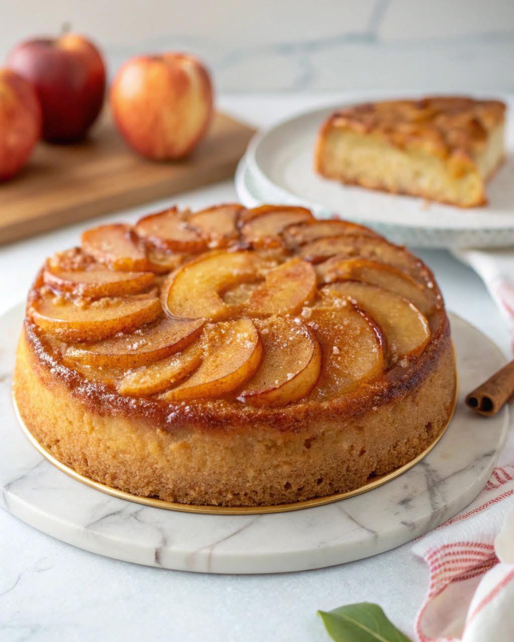 * Prepara la base caramellata e le mele: Imburra e fodera il fondo di una tortiera rotonda (circa 20-22 cm di diametro) con carta forno. Spargi uniformemente lo zucchero di canna sul fondo della tortiera. Disponi le fettine di mela a raggiera o in cerchi concentrici sopra lo zucchero, cercando di coprire tutta la superficie. Spolvera con la cannella e, se lo usi, un pizzico di noce moscata. Versa il burro fuso sulle mele.