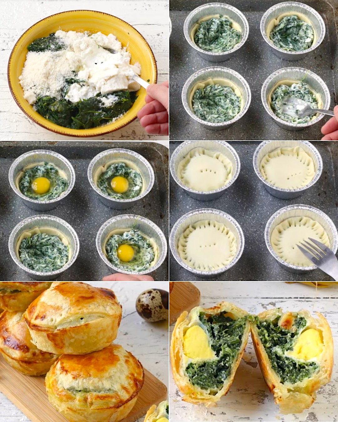 Nella ricetta abbiamo realizzato delle mini pasqualine con la pasta sfoglia già pronta e le uova inserite nel ripieno, come vuole la ricetta originale, ma in questo caso di quaglia: in alternativa potete sostituirle con uno spicchio di uovo di gallina sodo. Se volete, potete realizzare la pasta sfoglia a casa, per un risultato ancora più goloso.