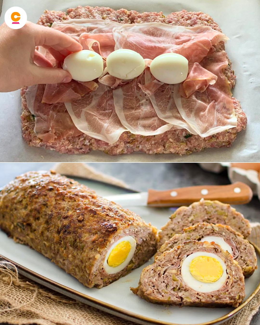 Una rivisitazione del classico polpettone al forno realizzato con il macinato misto di manzo e di maiale, che conquisterà tutti per il gusto ricercato e per il ripieno goloso e scenografico a base di prosciutto crudo a fettine e uova sode intere, ben visibili al taglio.