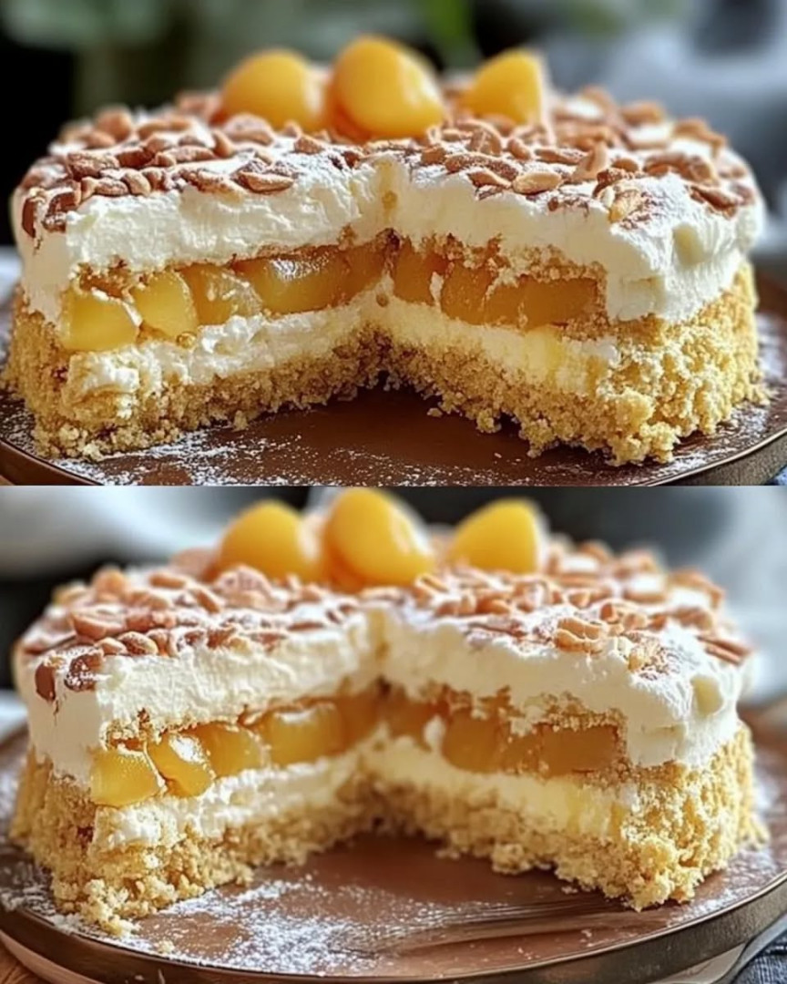 Per la Base della Torta 2 uova grandi (a temperatura ambiente) 100 g zucchero semolato 8 g zucchero vanigliato 50 ml olio di girasole 50 g burro, sciolto 340 g farina tipo 00 10 g lievito in polvere Per la Crema di Ripieno 400 ml latte intero 10 g zucchero vanigliato 1 tuorlo d’uovo grande 45 g zucchero semolato 32 g amido di mais 200 ml panna da montare 200 g pesche sciroppate, tagliate a dadini Per la Decorazione 100 g mandorle a fettine 30 g zucchero a velo