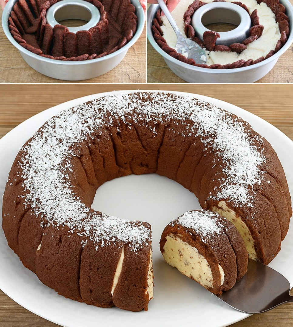 Fodera uno stampo a ciambella (da 22 cm circa) con i biscotti imbevuti, rivestendo fondo e pareti.