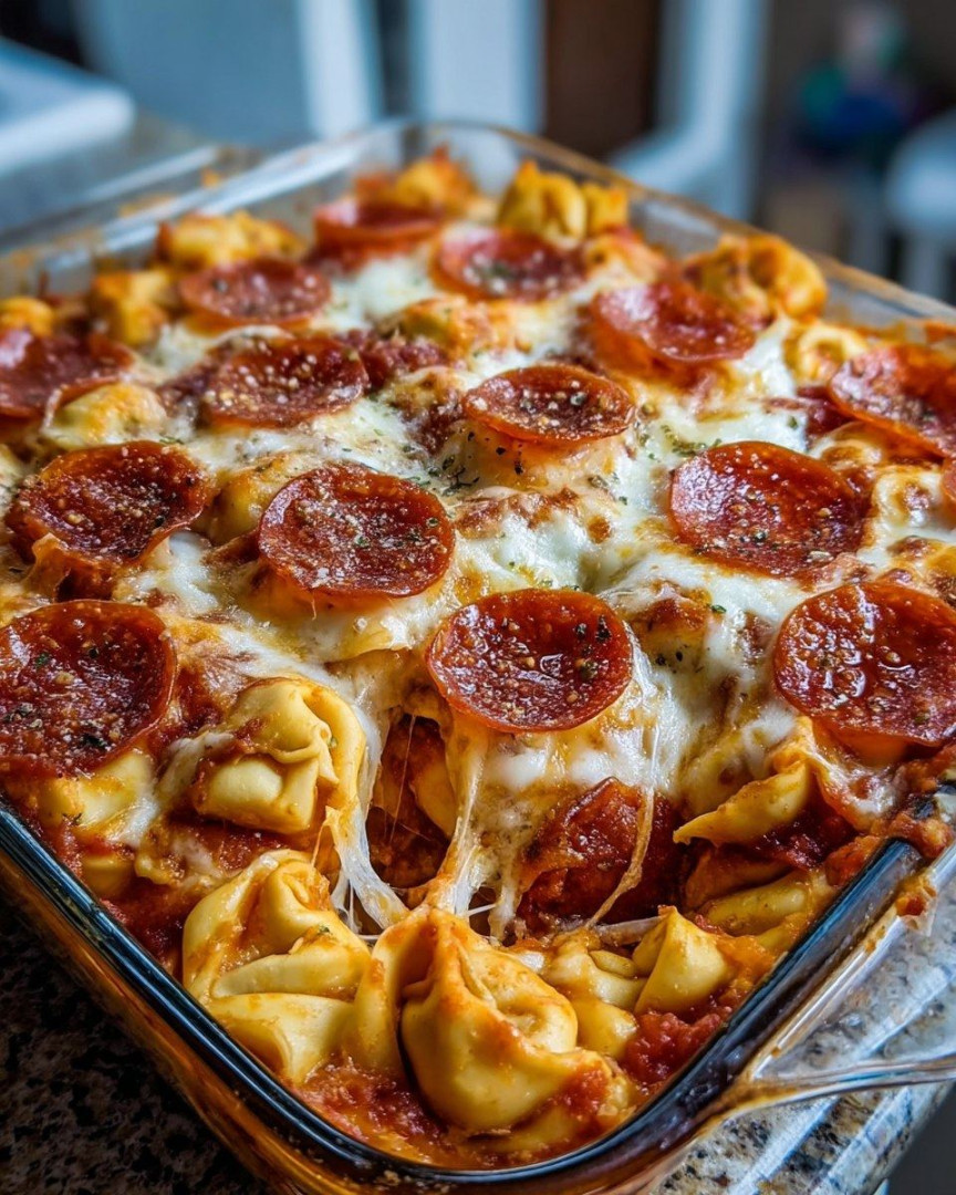 Pizza in teglia con tortellini al formaggio e pepperoni
